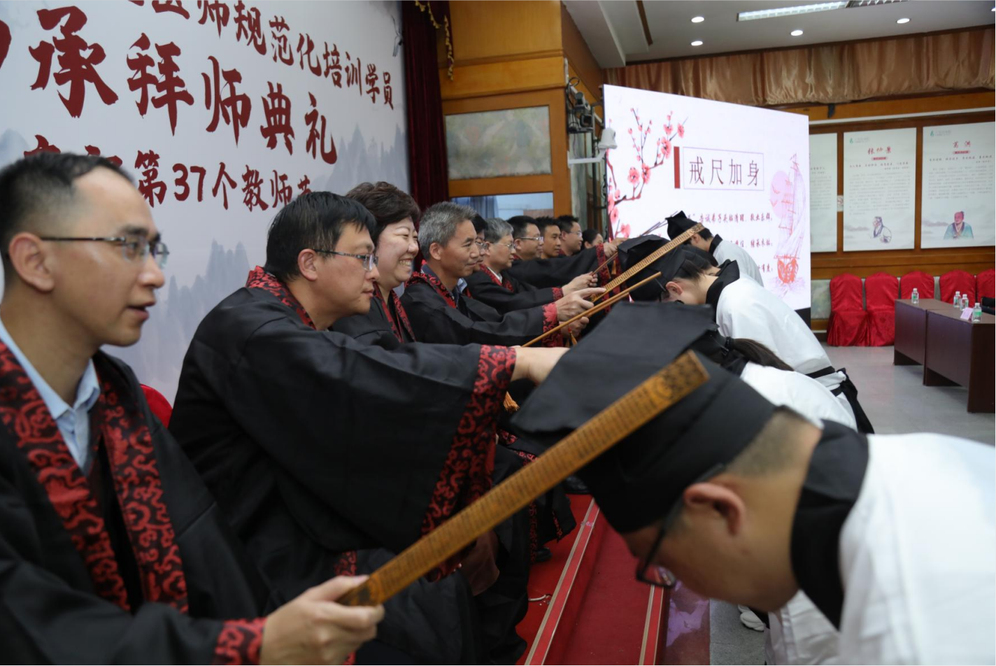 戒尺加身(诸位导师将用刻有《弟子规》的戒尺轻敲弟子,以告诫诸位弟子,在今后从医求学的路上应该恪守规范。“一敲头”告诫弟子头脑清醒,敬业乐群。“二敲肩”寓意弟子肩负重任,继承衣钵。“三敲身”提醒弟子为人有尺,处世有度。)