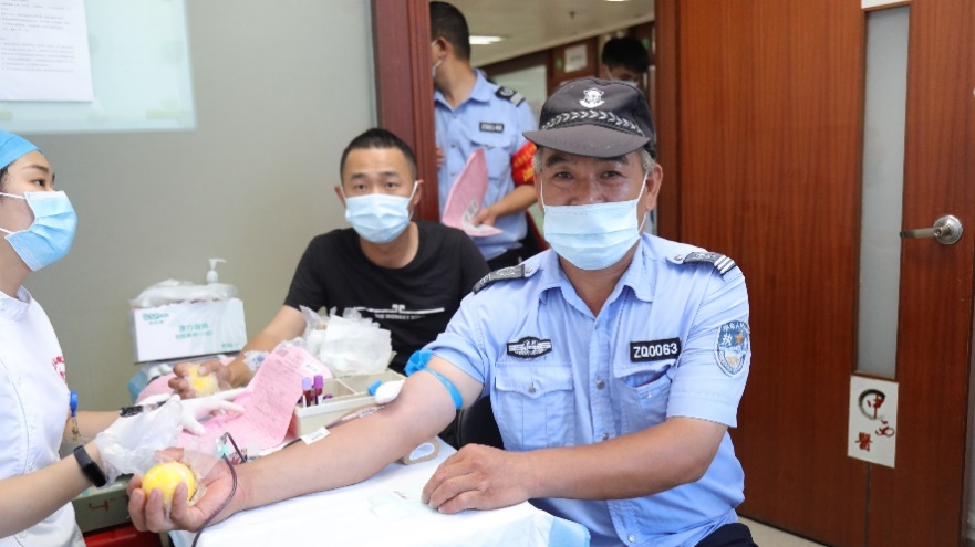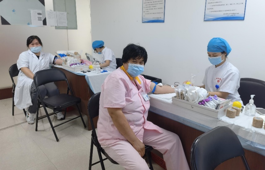 在医院医护人员的鼓舞号召下,后勤保障人员如保安大哥、卫生阿姨等都争先恐后地加入到献血行列中。
