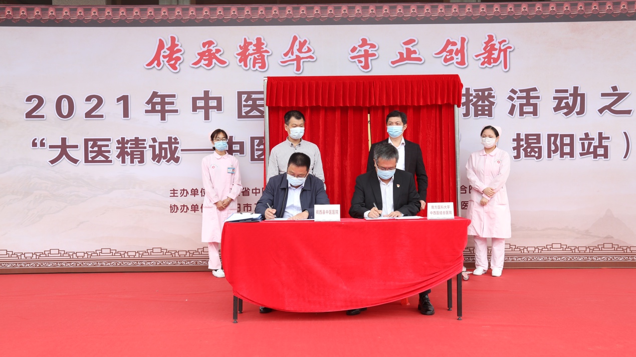 随后,南方医科大学中西医结合医院院长李爱民和揭西县中医医院院长刘良燕为针推康复科、骨伤科专科联盟建设举行签约仪式,揭阳市卫健局中医科科长袁杰群、揭西县卫健局副局长王继勇、南方医科大学中西医结合医院针推康复科主任周国平教授、骨伤科徐楚江主任医师参与揭牌仪式。