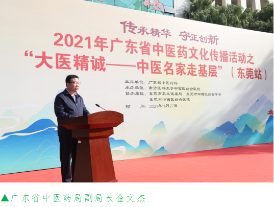 广东省中医药局副局长金文杰表示,“大医精诚—中医名家走基层”活动是传播中医药文化的实际举措,是开展党史学习教育“我为群众办实事”实践活动的具体行动,是学习贯彻全省中医药大会精神的重要举措,希望全省各地要把中医药文化传播摆在重要的议事日程,积极采取行动,擦亮“大医精诚”品牌,开展多种形式的中医药文化传播活动,讲好中医药故事,传好中医药养生保健真经,让中医药知识、方法飞入寻常百姓家。全省中医药工作者要转变思想观念,在提供中医药服务的同时,做好中医药文化的传承人、讲述者、翻译家,积极传播中医药文化,争做“大医精诚”的自觉践行者,健康中国建设的坚定推动者、人民健康的忠诚守护者,为打造中医药强省,助力建设健康中国、实现中华民族伟大复兴的中国梦贡献中医药力量。