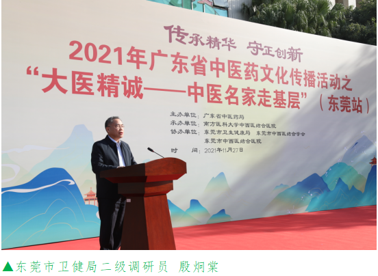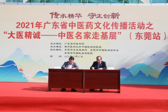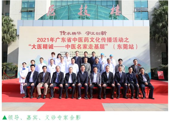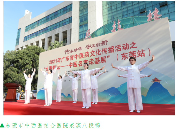 11月27日,2021年广东省中医药文化传播活动之“大医精诚——中医名家走基层”活动走进盛产道地药材“莞香”的东莞,在东莞市中西医结合医院举行大型义诊、八段锦表演、专科联盟签约揭牌、《广东省中医药条例》宣讲、中医适宜技术推广培训等活动,把优质中医药健康服务和中医适宜技术送到老百姓家门口,受到当地医务工作者和群众热烈欢迎。