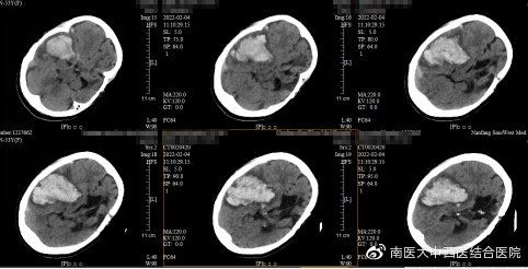 2022年2月4日大年初四早上,来自增城的53岁李阿姨(化名)突发昏迷,被送到南方医科大学中西医结合医院急诊科。CT提示右侧颞顶叶大量脑出血(约122ml),脑疝,病情危急!大年初四值班的医护人员第一时间开通绿色通道,神经医学中心兼神经外科陈陆馗主任迅速制定手术方案,在麻醉科朱倩玲主治医师等医护人员的紧密配合下,神经外科张建锋主治医师成功为李阿姨完成右颞部小骨窗脑内血肿清除术,术程顺利,术后患者恢复自主呼吸。据了解,李阿姨2年前曾因左侧基底节区高血压脑出血在该院接受手术,这次家人同样选择相信该院神经外科团队,医护人员再次挽回了李阿姨的生命。