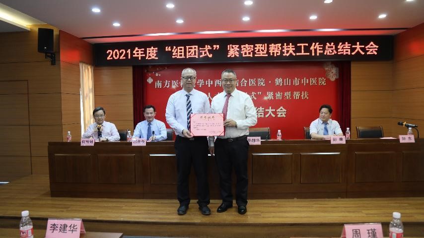 2019年底,根据中共广东省委组织部、广东省卫生健康委员会“组团式”紧密型帮扶工作统一安排,我院对鹤山市中医院开展帮扶,今年是第三个年头。2021年,医院选派了钟东、田新发、陈杰彬、翁勰、蔡佳辰常驻鹤山市中医院,根据广东省卫生健康委 中共广东省委组织部《关于印发广东省医疗卫生人才“组团式”紧密型帮扶工作方案的通知》(粤卫办人函〔2022〕6号)文件精神,从2022至2025年,我院将再进一步帮扶鹤山市中医院,2022年我院派出消化内科钟东、肿瘤四科(肝胆胰肿瘤科/肝病科)翁勰、重症医学科蔡佳辰、外二科(甲乳血管外科/ 肛肠科)唐巍、肾病科李成杰作为第三批帮扶队队员参与帮扶工作,钟东任帮扶队长。