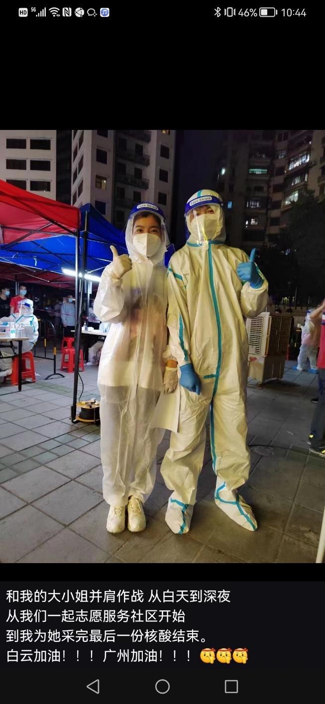 他与女朋友齐宁(广州银行白云支行党员员工)索性一起,报名当社区志愿者,就地支援,朱立鹏负责核酸采样,齐宁负责协助扫码。
