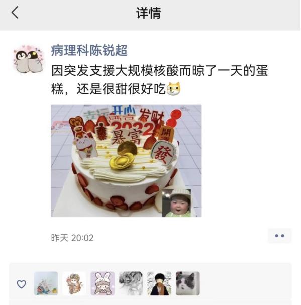 “因突发支援大规模核酸而晾了一天的蛋糕,还是很甜很好吃。”4月11日广州医科大学附属第三医院病理科医生陈锐超医生在朋友圈写道。