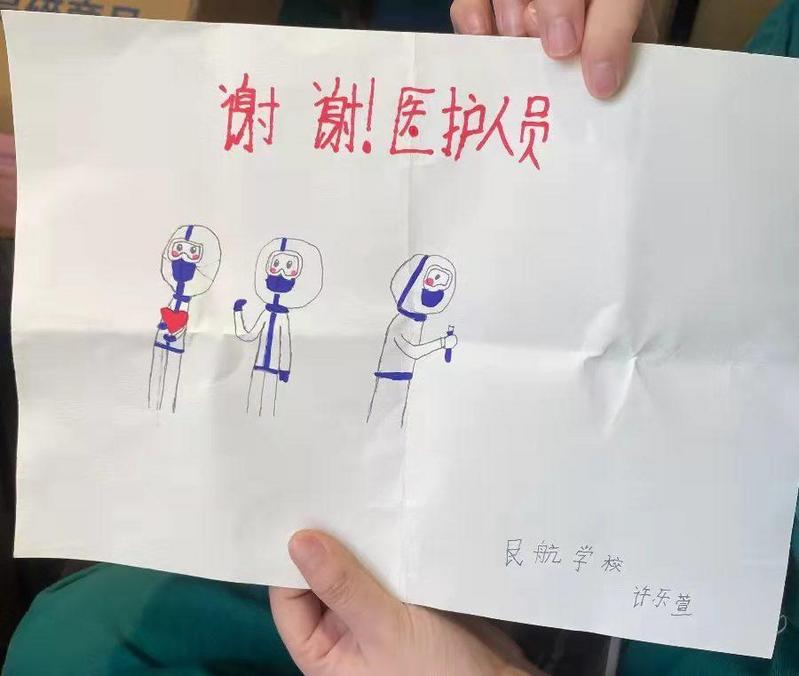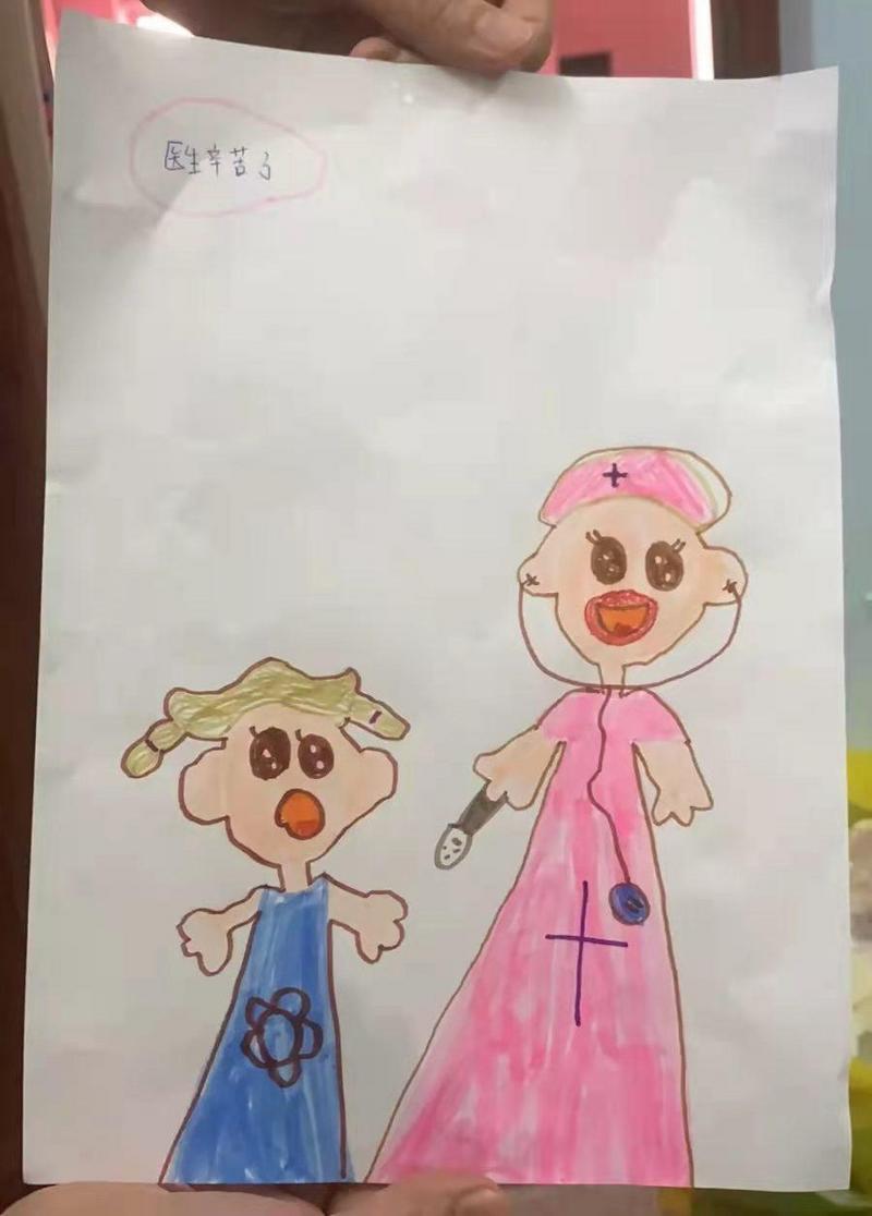 “你看,这是护士姐姐,这是我,我们站在一起抗疫!”一双稚嫩的小手将这幅画送给医护人员。