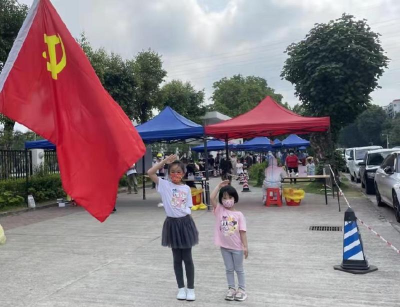 准备离开时姐姐看到旗帜飘扬的党旗,立马举起手敬了个礼,妹妹看到后,也有模有样地学起来,把现场的医护人员都逗乐了。