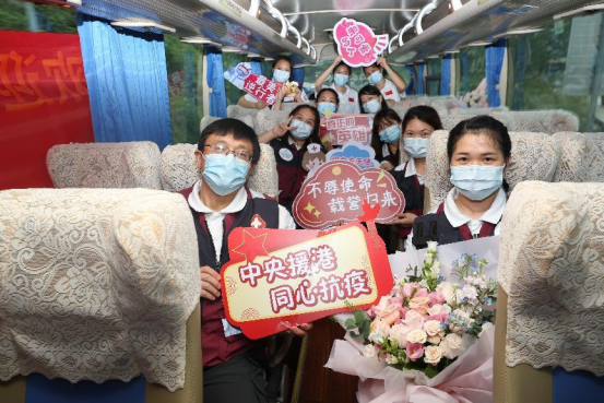 “我和我的祖国,一刻也不分割……”在深圳返回广州的大巴上,队员们激动地唱起了《我和我的祖国》。“心情很激动,有自豪也有感动,在医院领导和同事们的大力支持下,援港医疗队终于不辱使命完成任务平安归来”,医院援港医疗队队长廖荣鑫说。