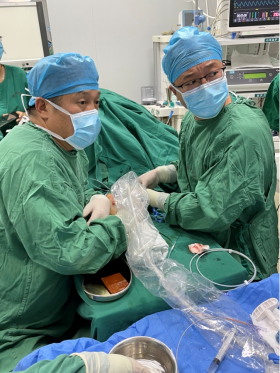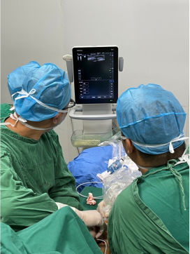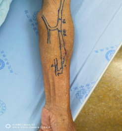 该患者左前臂血管彩超提示:头静脉前臂段管壁局部增厚,局部管腔狭窄,残余管腔内径约0.7mm,桡动脉瘘口近心端近瘘口处管腔明显变细。鹤山市中医院血液净化中心团队详细分析病情并与患者及家属沟通,决定施行超声引导下动静脉内瘘狭窄后经皮腔内血管成形术(PTA)。南方医科大学中西医结合医院派出的帮扶医生李成杰、及臻臻为患者施行超声引导下PTA术,术程顺利,复查血管彩超显示血管管腔通畅,术后已作为血管通路进行血液透析。