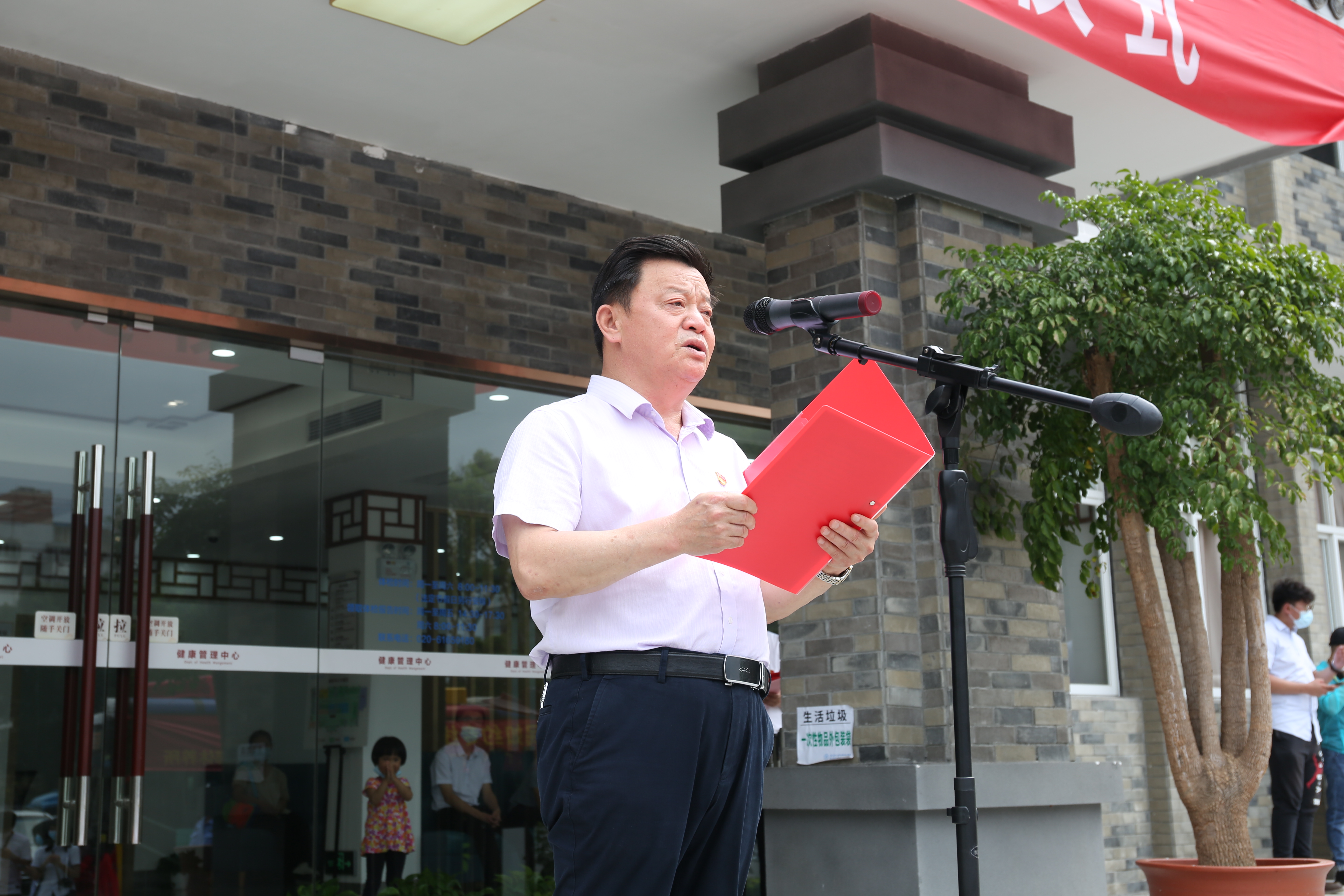 医院党委书记严冬、江海街道办事处主任林淑妍、广州巴士集团副总经理、电车分公司党委书记、经理苏卫东及广州军区第十三离职干部休养所中校参谋徐希等领导参加揭幕并合影