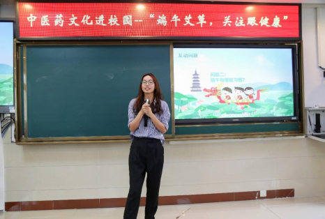 上课伊始,钟一萍老师从端阳采艾的传统和《本草歌》等内容引出了“端午艾草香 关注眼健康”的活动主题,为学生们介绍端午节的知识,讲解了端午节的历史由来,就端午节别称、习俗等问题与学生们亲切互动。学生们兴趣浓厚,争相发言,课堂气氛活跃。