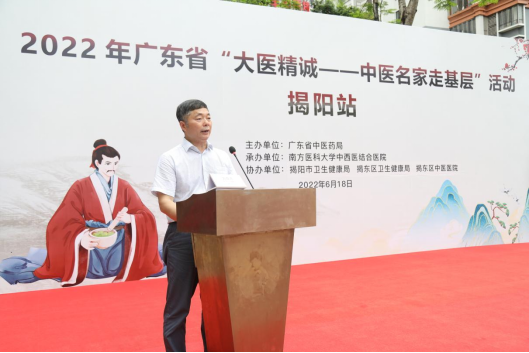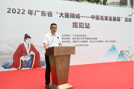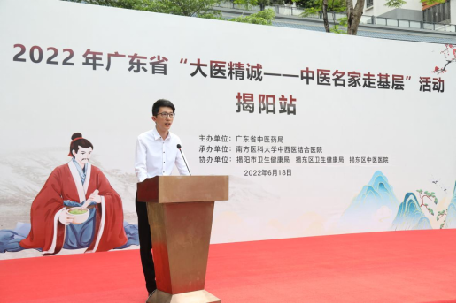 揭阳市卫生健康局副局长刘自忠、南方医科大学中西医结合医院副院长彭康、揭阳市卫生健康局中医科科长袁杰群、揭东区卫生健康局副局长林如婵、揭东区中医医院院长陈乙彬等领导、嘉宾出席了本次活动。仪式由南方医科大学中西医结合医院团委副书记吴佳仪主持。