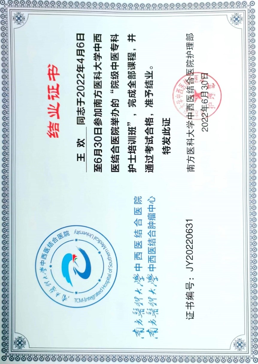 最后,护理部周瑾主任对本届院级中医专科护士培养进行总结,首先祝贺5名院级中医专科护士顺利结业,希望她们以此为起点,不断增强自身中医护理内涵建设,夯实理论基础;以院级中医专科护士为试验田,逐步展开其他院级专科护士的培养;打造一支专科护理能力强的护理团队,更好地为患者服务。