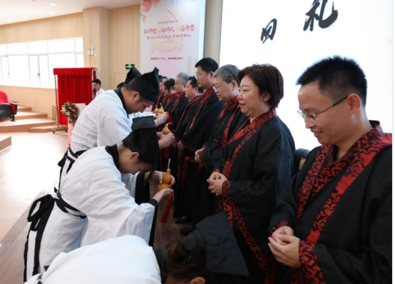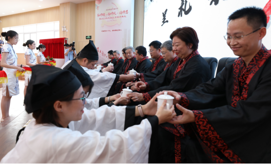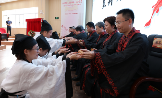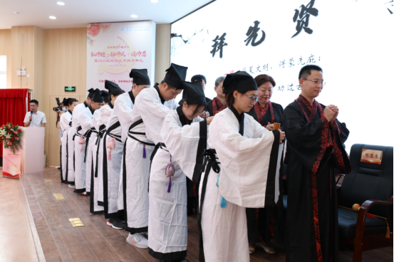 而后,开始了传统的一年一度的拜师典礼。拜师典礼现场,10名弟子向师承导师行跪拜礼、递交“拜师帖”,奉赠束脩六礼,呈敬礼茶,表达了对老师的敬意,答谢老师收于门下,也表明了自己发奋努力、立志继承老师学术思想的决心。