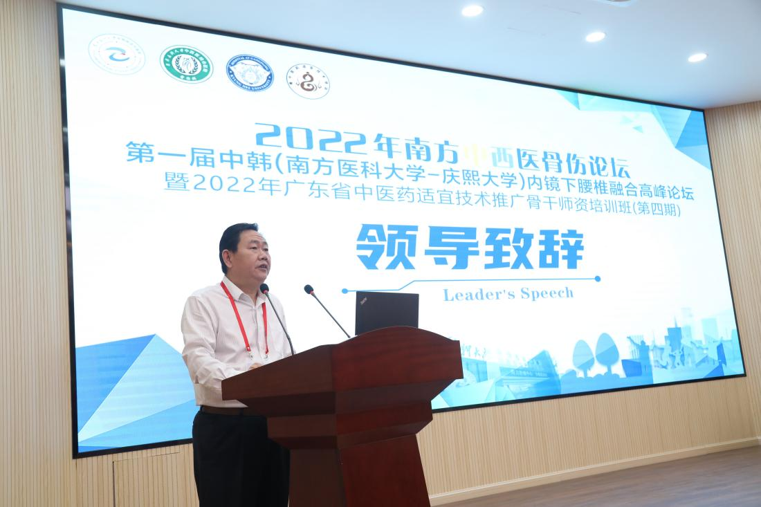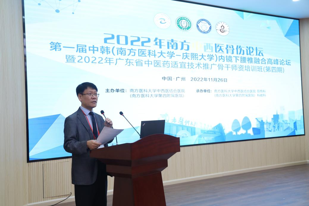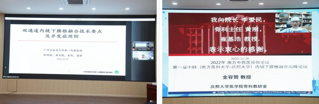 “探讨内镜下腰椎融合的临床经验及新进展”,2022年11月26日上午,由南方医科大学中西医结合医院主办,医院骨伤科、科教科承办的“南方中西医骨伤论坛之2022年第一届中韩(南方医科大学-庆熙大学)内镜下腰椎融合术高峰论坛暨2022年广东省中医药适宜技术推广骨干师资培训班(第四期)”采取线上、线下相结合的形式在医院智慧诊疗中心会议厅顺利召开。医院按要求落实疫情防控政策措施,严格控制线下参会人数。