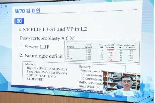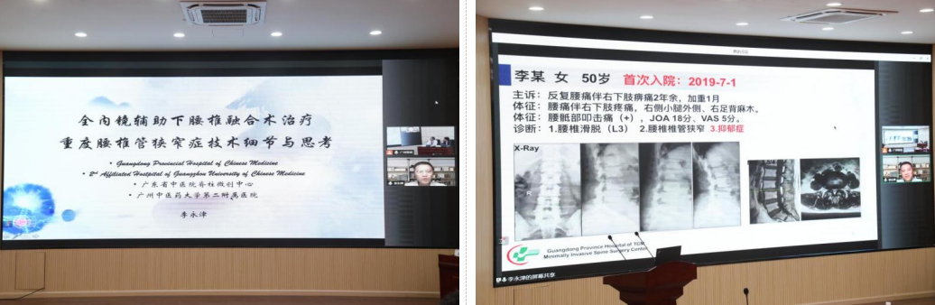 开幕式后,各位学界大家的精彩报告陆续展开。南方医科大学中西医结合医院何二兴教授深入浅出的分享《内窥镜下腰椎融合中的双镜技术》,宁波市第六医院(骨科医院)蒋伟宇教授为讲授分享《对比内镜下融合和显微镜下融合的各自优势》,韩国翰林大学附属江东圣心医院李根浩教授分享《双通道内镜下融合技术的现状和发展趋势》,南方医科大学中西医结合医院崔基浩教授分享《目前国际上镜下腰椎椎体融合术的最新进展》,广州中医药大学第一附属医院张顺聪教授结合大量的临床实践经验讲解《双通道内镜下腰椎融合的技术要点及并发症预防》,韩国庆熙大学附属医院金容赞教授结合丰富临床经验及国际权威研究进展讲解《如何减少内镜下腰椎融合并发症的诊治经验》,广东省中医院李永津教授讲解《腰椎全内镜下融合的技术细节以及对这项技术的深入思考》,并邀请与会的各位专家同道一同探讨相关病例。随后,韩国庆熙大学附属医院金容赞教授在线上分享病例讨论。精彩的病例分析、精湛的手术技巧和良好的疗效赢得了满堂彩。