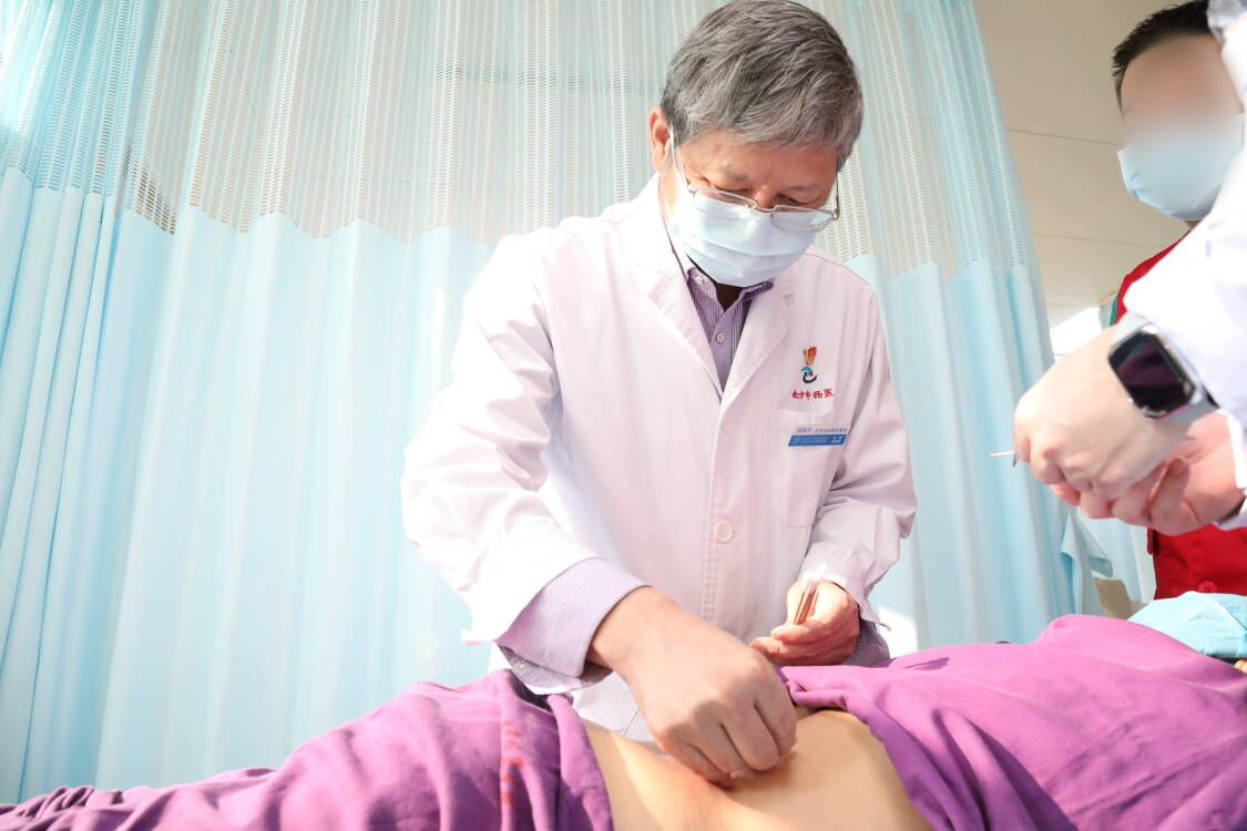 针推康复科主任导师周国平给患者施针时一边给佛冈县中医院医生带教