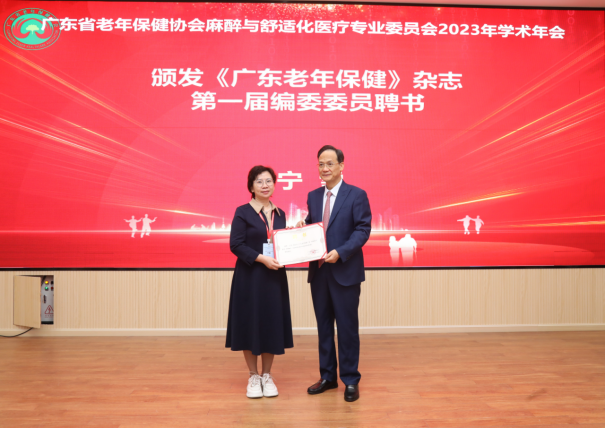会上,周光清会长为宁雪主任颁发了«广东老年保健»杂志第一届编委委员聘书。