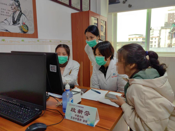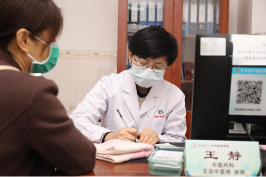 一位中年妇女走进了中医内科诊室,她自述失眠三四年,口干口涩时睡眠更不好,经常情绪低落。“你要学会自己解压,不要想太多……”中医药学院中医内科学王静博士细心开导患者,给他开具中药处方,并将煎药注意事项细心地写在药袋上:“大火烧开后转小火煮够40分钟。记得里面放2-3片姜,服药期间不喝茶。”