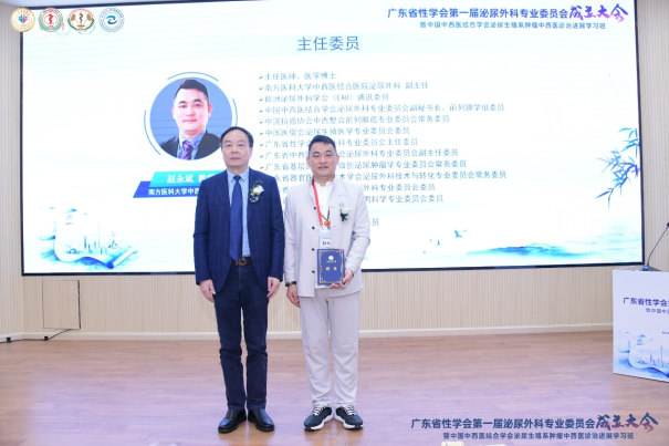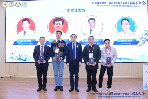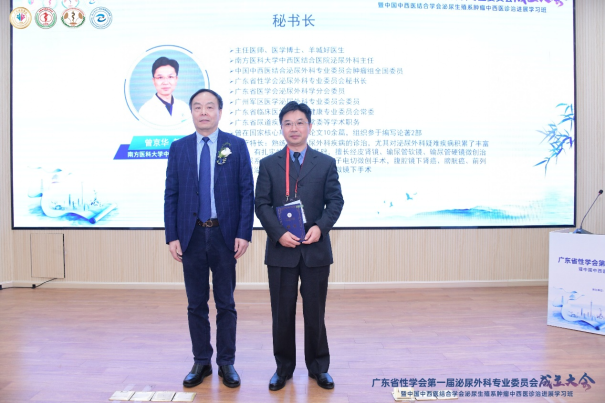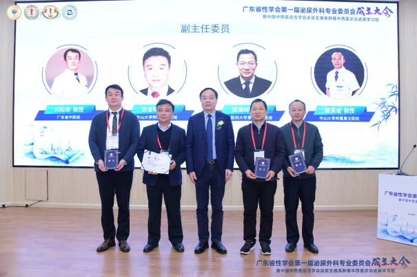 广东省性学会第一届泌尿外科专业委员会由我院泌尿外科赵永斌教授担任主任委员,曾京华教授担任秘书长,以及来自省内各大三甲医院泌尿外科12位教授担任副主任委员。胡卫列会长分别给各位颁发了聘书。
