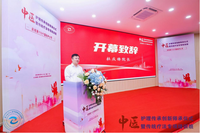 南方医科大学中西医结合医院杜庆锋院长对本次师承仪式及培训班的举办表示热烈祝贺,并对每一位护理人员致以节日的问候。他指出,本次活动旨在发挥医院“传帮带”作用,提高基层群众就地就医的可及性,促进医疗水平的整体提升。他希望各位学员珍惜本次交流机会,从各方面提升自身能力,为中医药事业薪火相传做出应有的贡献。
