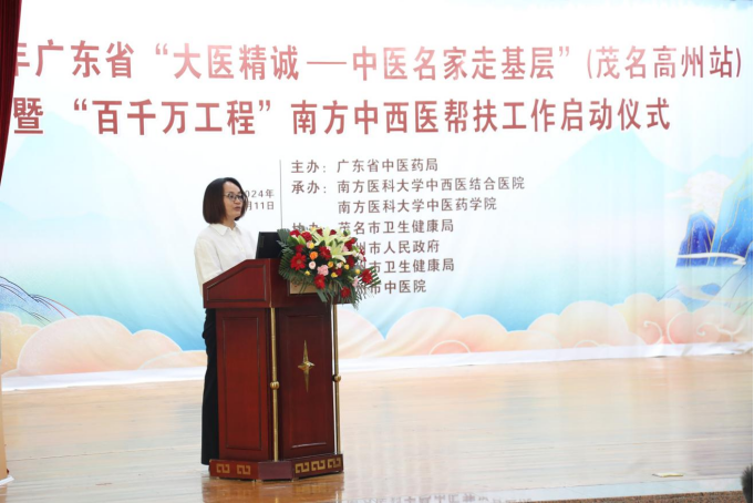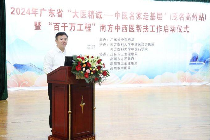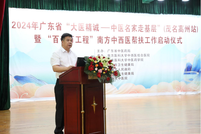 本次活动由广东省中医药局主办,南方医科大学中西医结合医院承办,茂名市卫生健康局、高州市人民政府、高州市卫生健康局、高州市中医院协办。广东省中医药局办公室主任刘占峰,南方医科大学中医药学院院长兼中西医结合医院院长杜庆锋,茂名市卫生健康局副局长宁凌峰,高州市人民政府副市长朱艳红,高州市卫生健康局党组书记、局长王森,高州市中医院党委书记吴任鸿、院长陈钦等领导嘉宾出席。仪式由南方中西医团委副书记吴佳仪主持。