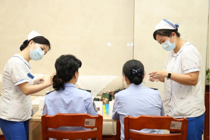 广东省中医专科护士陈晶晶、林淑珠为民警提供了温灸刮痧、耳穴疗法、穴位贴敷等特色中医护理操作。“感觉肩颈的僵硬和疼痛瞬间缓解了不少,整个人都轻松了许多。”一位民警在体验了温灸刮痧后表示。