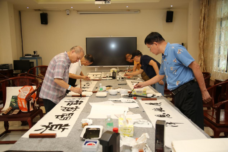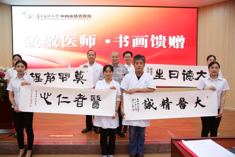 表彰会上,嘉宾向医生代表和医院馈赠书画,暖意洋洋,这个环节的安排还缘于一位“患友”的大爱。原来,广东省老干部书画诗词摄影家协会会长陈俊生近期正在医院和园(全科医学科)康养,他亲眼目睹医护工作人员的辛苦与付出,作为艺术家的他敏觉地想到要在医师节为大家做点什么,于是他想到邀请同行来院开展一场挥毫送墨活动,以实际行动向医务工作者表达敬意。他的想法得到同行积极回应,同时也得到广东潮青会的热情响应,于是有了这场别开生面的翰墨丹青礼。