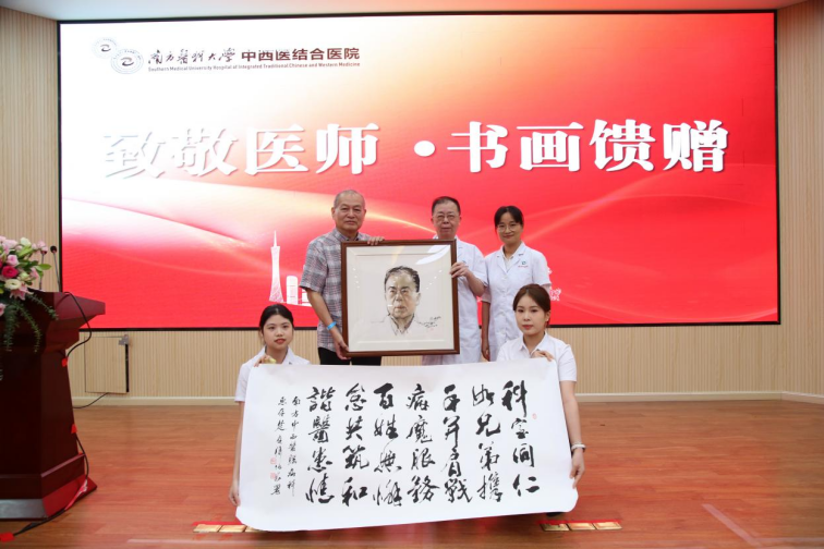 全国医德标兵、脑病科陈俊抛主任接受国画老师李伟文创作的个人肖像画以及何伯昌老师给脑病科创作的科室寄语