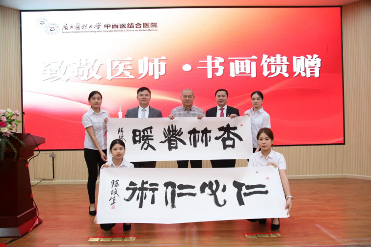 会上,广东省老干部书画诗词摄影家协会会长、广东省文联艺术馆原馆长陈俊生将一幅幅“私人定制”的书法作品作为医师节礼物亲手赠送给优秀医师代表们,“医师,是一个崇高的职业,医务工作者们舍小家为大家的精神值得全社会学习和尊重。”陈俊生作为老艺术家,表达了对医务工作者的敬意与祝福。