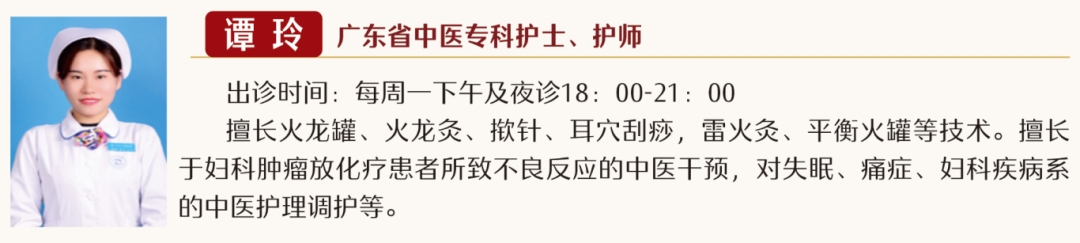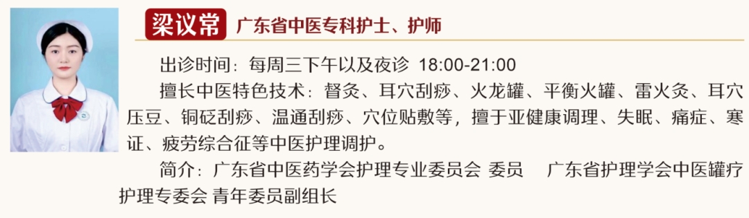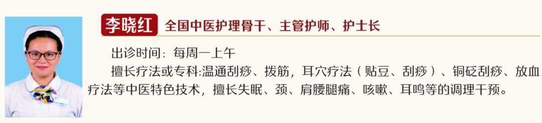 中医特色护理小组由全院13名中医护理骨干组成,中医特色护理门诊从2018年10月开始创建,由原有的4名出诊人员增加至13名中医护理专家出诊,根据日益增长的患者需求,医院安排出诊时间为每周一至周五全天,周一、周三、周五夜诊18:00-21:00,以及周六、周日上午8:00-12:00。