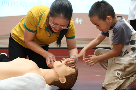 一名校医带着孩子一起学习心肺复苏急救
