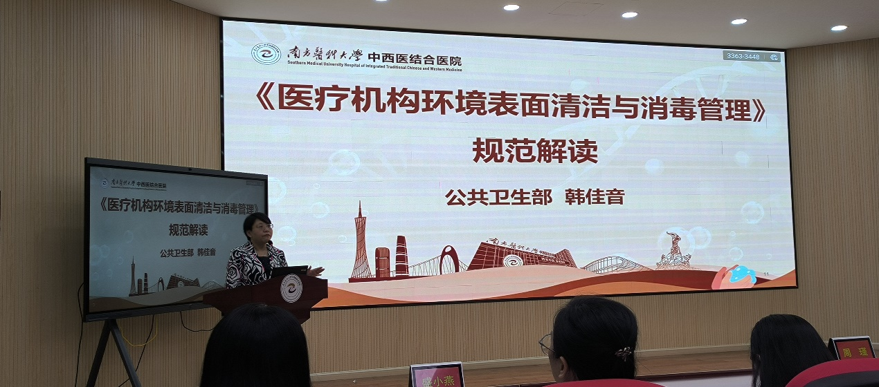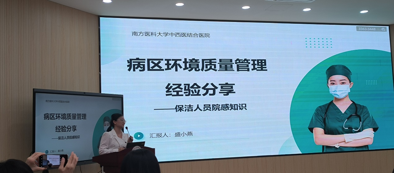 颁奖典礼后,公共卫生部韩佳音主任为医院全体护士长、保洁和陪护人员进行了《医疗机构环境表面清洁与消毒管理规范》的解读,普外科盛小燕护士长就如何做好病区环境质量管理做了经验分享。