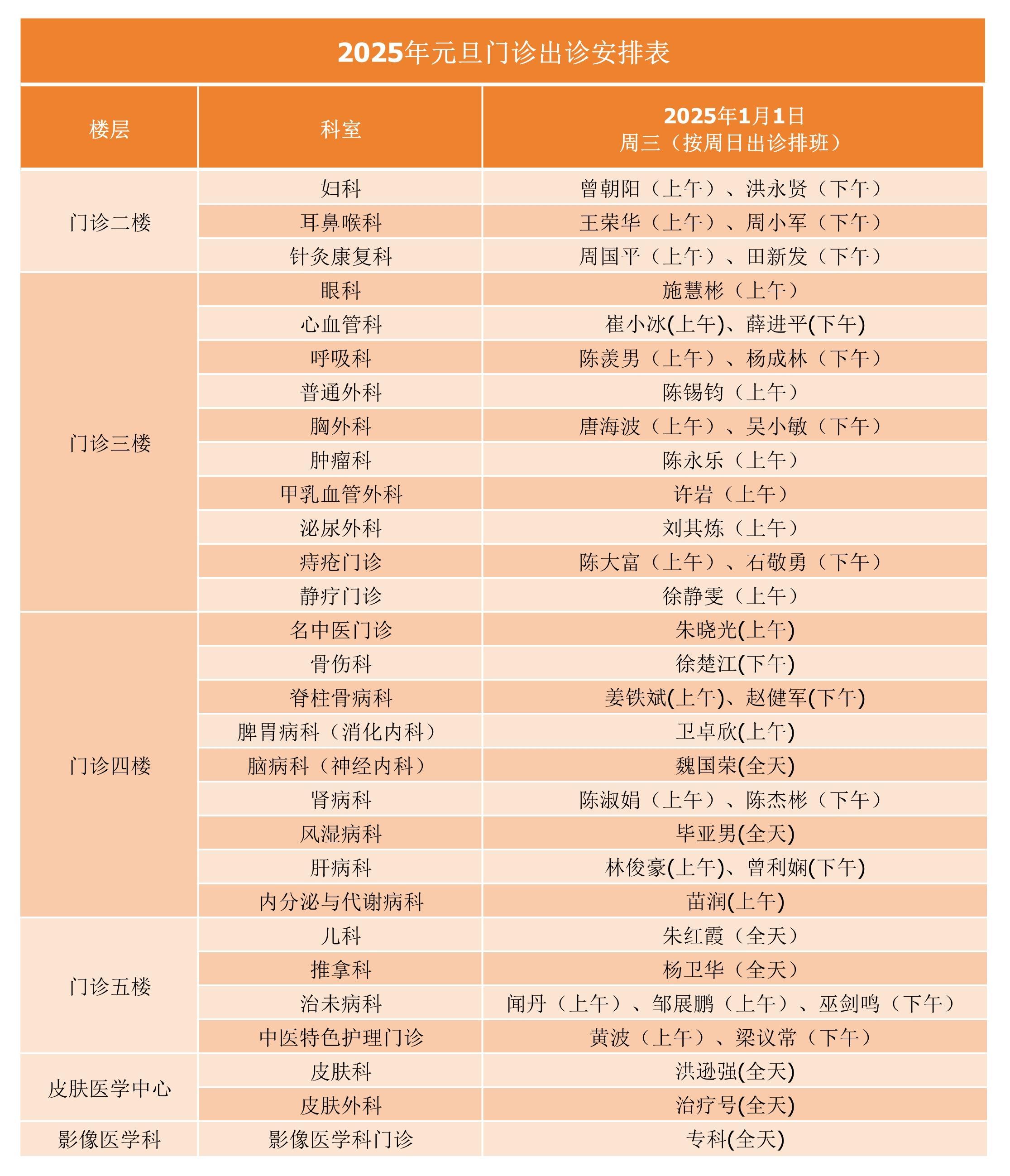 2025年元旦门诊出诊安排表