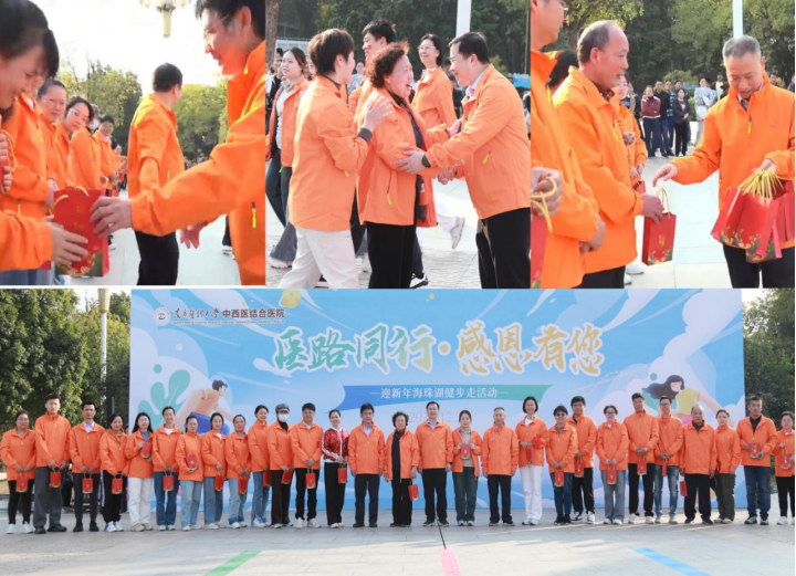 12月27日下午,冬日暖阳下一场别开生面的活动在海珠湖北广场热烈展开,活动以幼儿园老师们表演的《龙舞飞扬啦啦秀》热身舞点燃了现场气氛。这是南方医科大学中西医结合医院组织的“医路同行,感恩有您”迎新年海珠湖健步走活动,由党委书记陈旭坚领队,全院400余名师生员工参加,活动内容丰富,包括拔河比赛、集体生日会、健步走、健康义诊等。团委负责人吴佳仪担任活动主持。