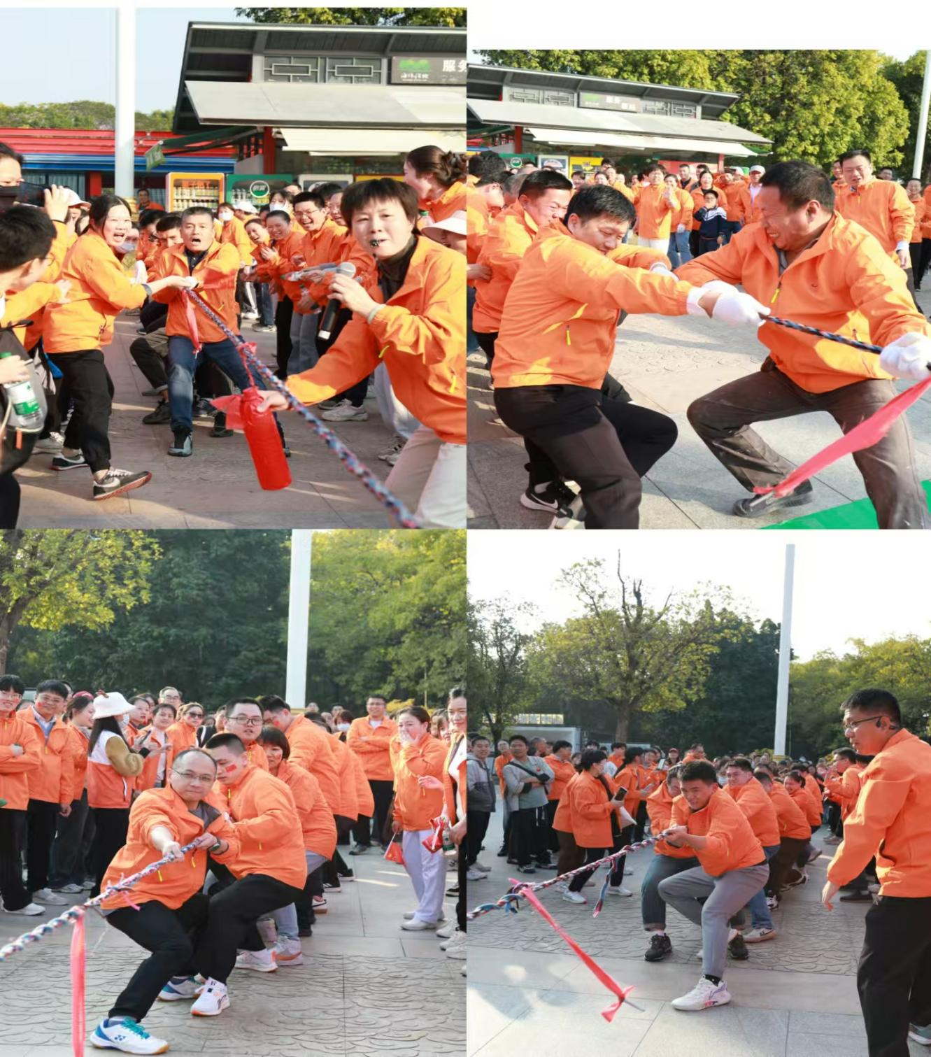 开场热身舞之后,拔河比赛成为了全场的焦点。参赛队员们身着统一橙色服装,个个精神饱满,斗志昂扬。随着裁判的一声哨响,拔河比赛正式开始。队员们齐心协力,咬紧牙关,拼尽全力向后拉拽。绳子中间的红绸带在双方之间来回摇摆,时而偏向一方,时而又被拉回原位,双方队员都毫不示弱。同事们的加油声、欢呼声此起彼伏,大家纷纷为自己支持的队伍呐喊助威,有的则激动地挥舞着手臂,整个广场都被热烈的气氛包围,现场还引来了不少游客围观。