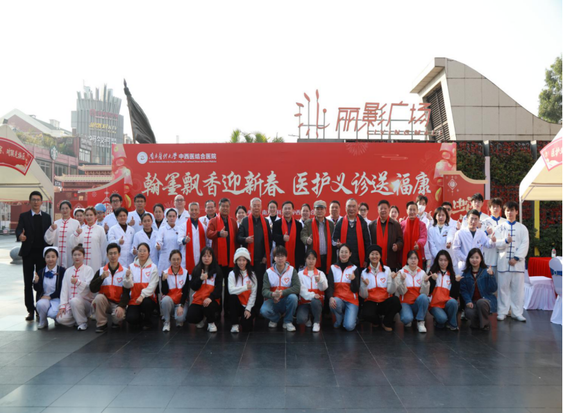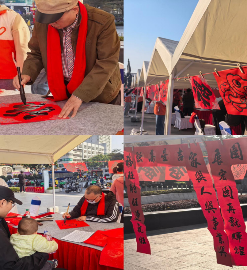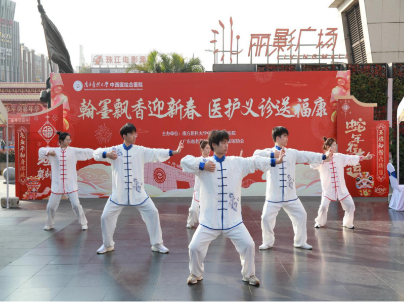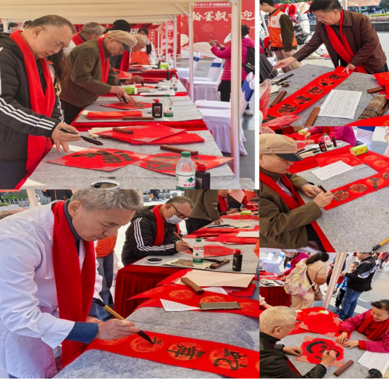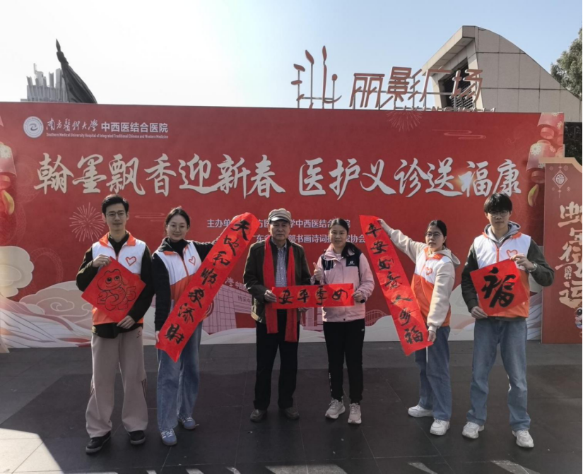 翰墨迎春,金蛇贺岁。在春节即将来临之际,为弘扬中华优秀传统文化,关心社区市民,提升公众的健康意识,南方医科大学中西医结合医院携手广东省老干部书画诗词摄影家协会于1月18日上午,在海珠区丽影广场举行“翰墨飘香迎新春,医护义诊送福康”惠民活动。南方中西医陈旭坚书记、书画协会会长陈俊生会长、李锐文副会长、石先进常务理事、余定军名誉会长、孟大东顾问、吴寿良老书法家、李新香办公室主任参加了活动,活动由团委负责人吴佳仪主持。