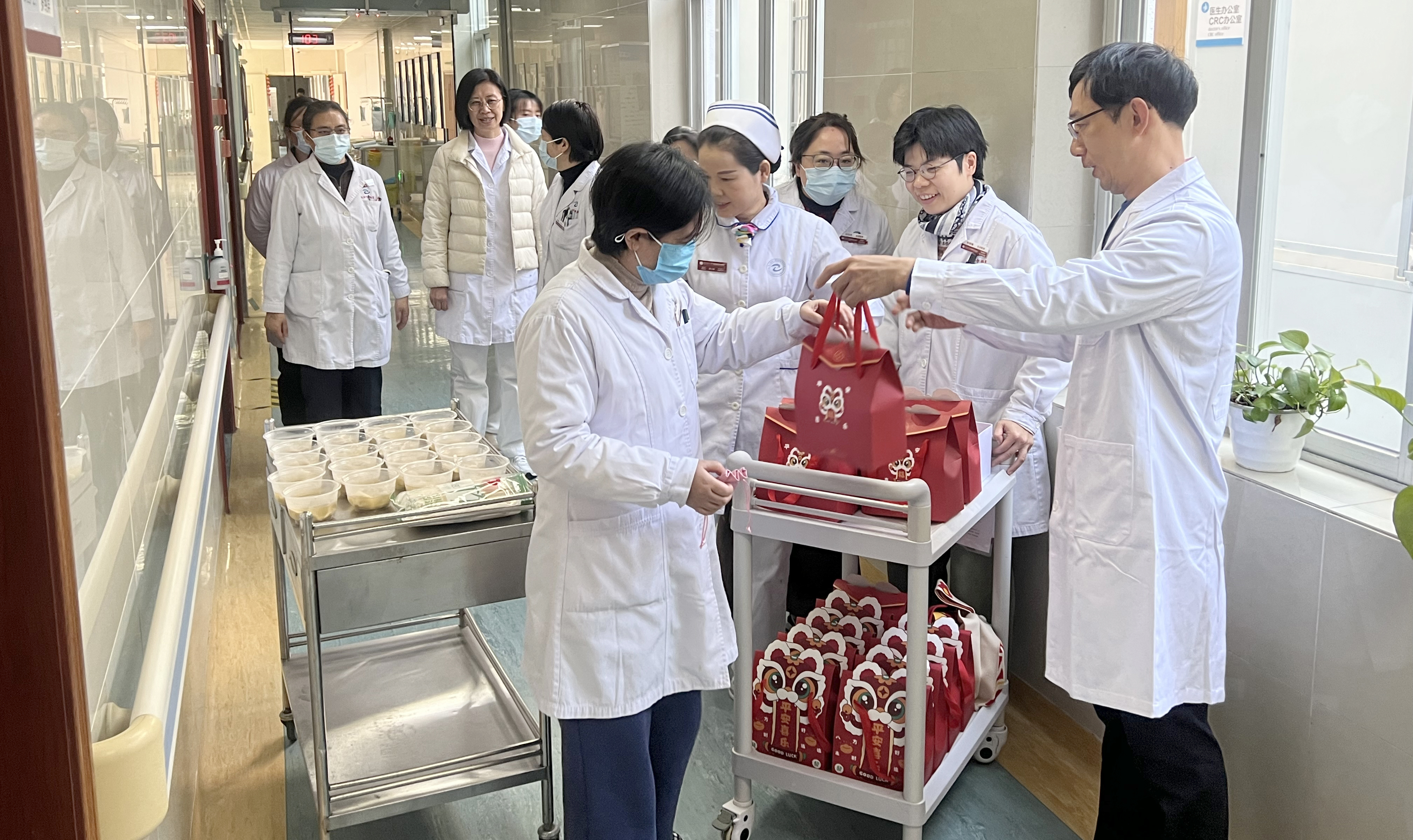 1月27日,我院肿瘤中心主任蔡红兵带领各病区负责人及医护人员,深入病房,逐一探望了因病情需要而留在医院过年的患者。亲切地询问病人的身体状况,耐心倾听他们的需求,并给他们送上了水饺、水果、养生香囊等慰问品及新春祝福。