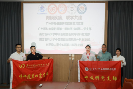 为加强党建与业务的深度融合,深化胸膜疾病诊疗领域的多学科协作,推动中西医结合诊疗模式创新发展,4月10日,南方医科大学中西医结合医院呼吸科党支部、胸外科党支部联合广州医科大学附属第一医院呼研院第四党支部、医技第二党支部、东莞市松山湖中心医院内科党支部,组织以“胸膜疾病,联学共建”为主题的党日活动,在南方中西医集中开展关于胸膜疾病诊疗创新研讨。