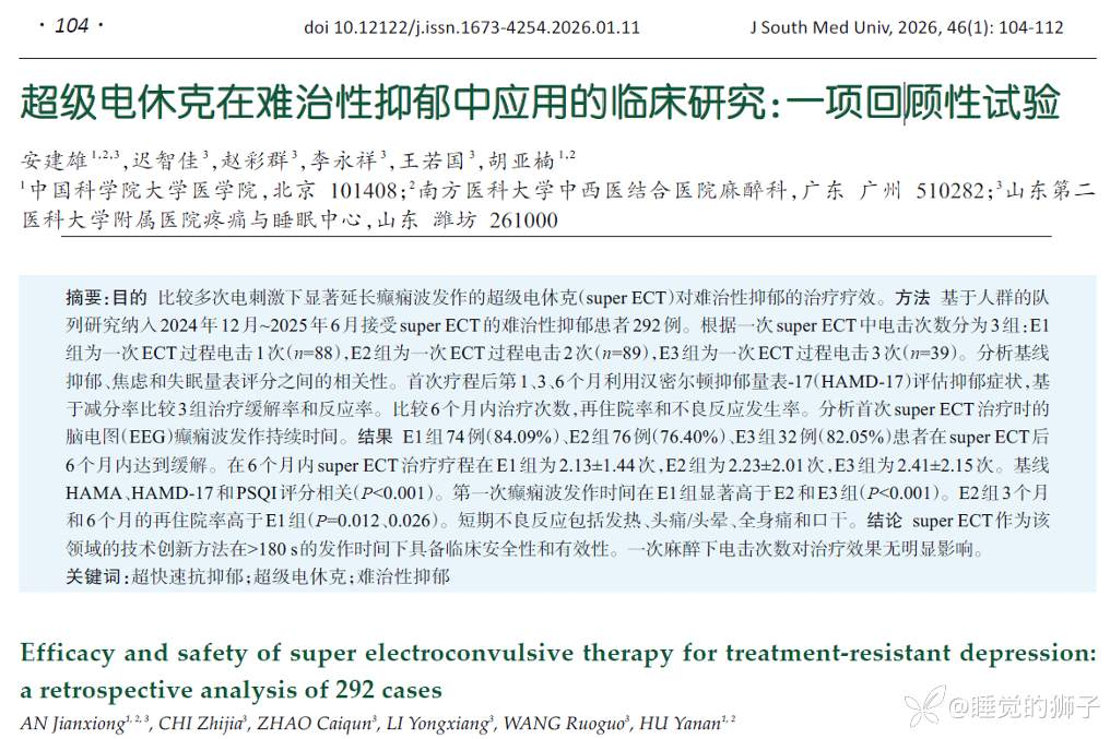 《2022年国民抑郁症蓝皮书》调查数据显示,我国抑郁症患者9500万人,每年有20多万人因抑郁症自杀,抑郁自杀人数还在持续攀升。抑郁自杀的主要原因是抗抑郁药物起效慢,平均半月到两月才起效,而且有三分之二病人因吃药无效或副作用大成为难治性抑郁。电休克是公认的抑郁自杀倾向的杀手锏,安建雄团队十数年来致力于难治性抑郁机制和治疗探索。安建雄博士牵头于2011年和2016在北京分别成立“国际电休克与神经刺激协会中国分会”和“中国医师协会神经调控专委会电休克与神经刺激学组”,2016年在国际电休克协会官方杂志发表“改良电休克再升级”,2022年和2024年先后在山东第二医科大学附属医院、南方医科大学中西医结合医院建立快速和超快速抗抑郁中心。近日,安建雄团队超级电休克临床研究成果发表在《南方医科大学学报》,论文由中国科学院大学在读博士胡亚楠、南方医科大学中西医结合医院、山东第二医科大学附属医院等单位超快速抗抑郁中心研究人员合作完成。《南方医科大学学报》原名《第一军医大学学报》,被著名美国国立医学图书馆PubMed收录,近年连续被评选为中国最具国际影响力期刊之一。