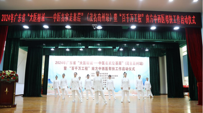 “左脚开步,与肩同宽,屈膝下蹲,掌抱腹前……”5月11日上午,一场传统健身术八段锦表演拉开了2024年广东省“大医精诚一一中医名家走基层”(茂名高州站)暨 “百千万工程”南方中西医帮扶工作启..