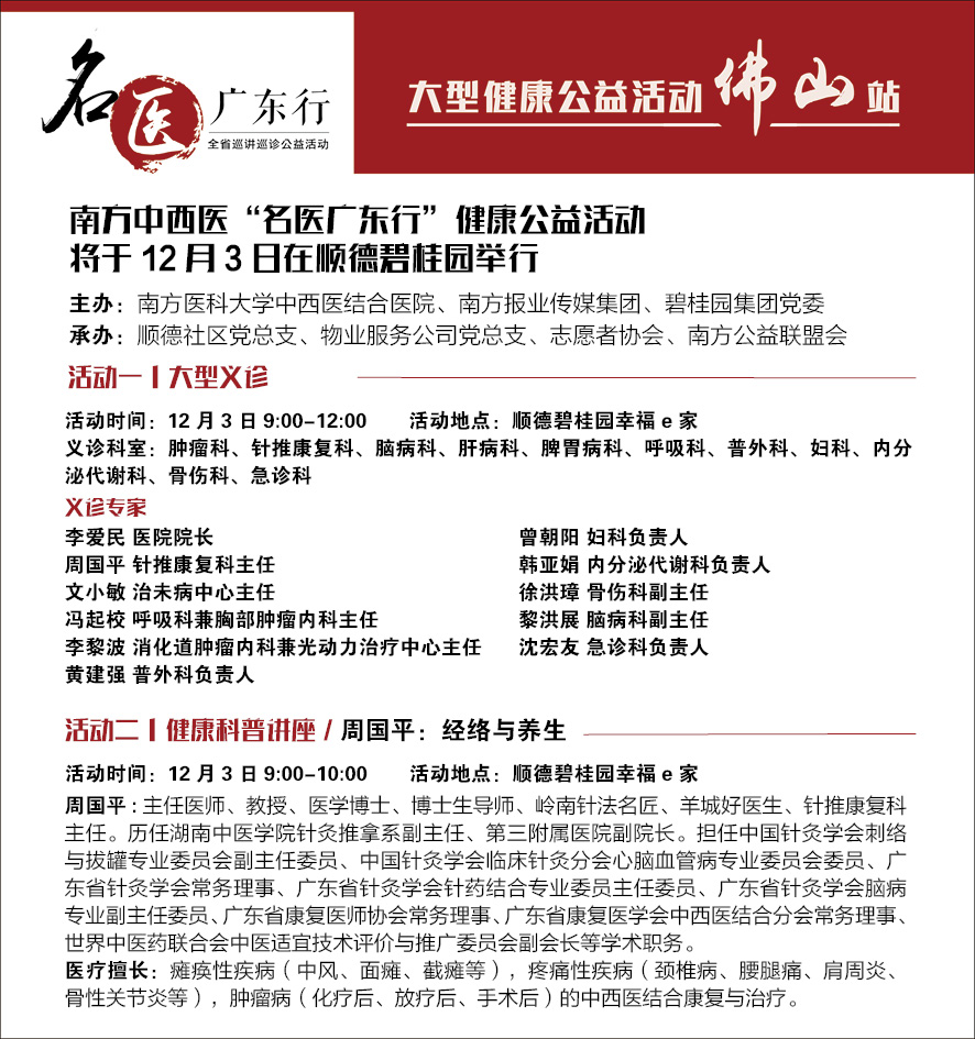 12月3日,由南方中西医、南方报业传媒集团、碧桂园集团党委联合举办的“名医广东行”健康公益活动在顺德碧桂园社区举行。