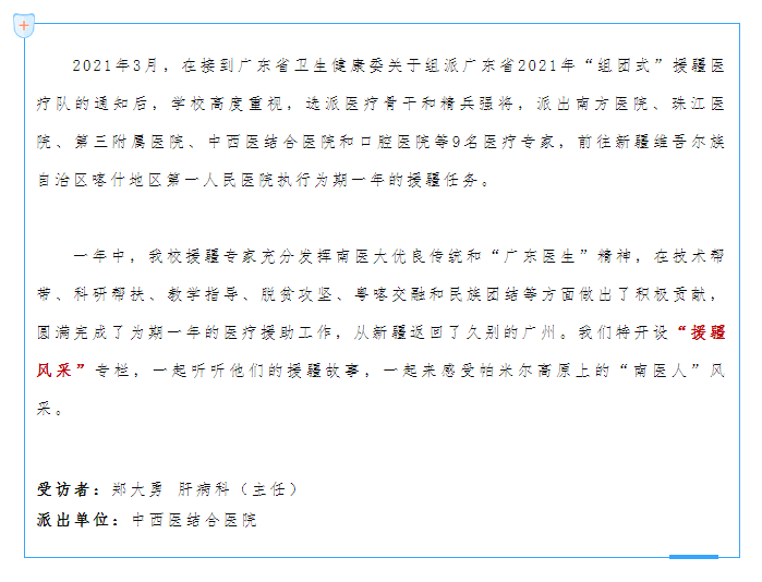 2020年3月,郑大勇积极响应党中央号召,义无反顾奔赴脱贫攻坚主战场——新疆喀什,担任喀什地区第一人民医院副院长及肿瘤中心主任,开启为期三年的援疆之路。2021年是郑大勇援疆的第二年,这一年他多了一个身份,喀什第一人民医院援疆党支部书记。