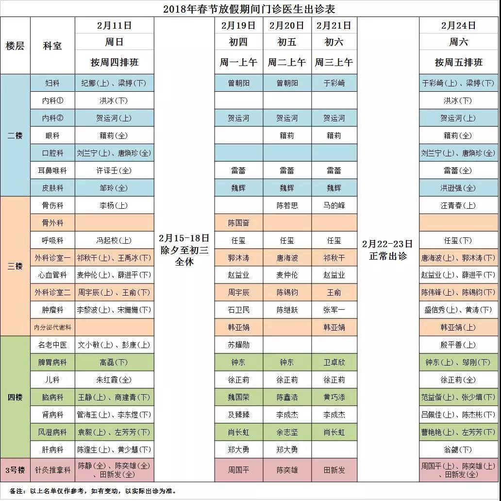 2018年我院春节放假安排为2月15日(除夕)至2月21日(正月初六),共7天(急诊不放假);节前2月11日(星期日)、节后2月24日(星期六)按国务院安排全院正常上班,为做好放假期间的工作,现就专家门诊出诊安排通知如下: