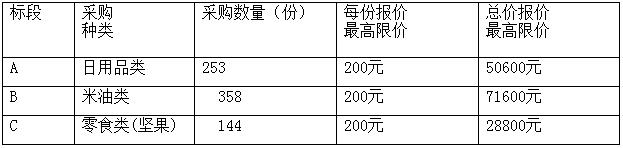 3、项目内容:本次共采购755份慰问品,每份慰问品价值200元。本项目共分A、B、C三个标段,供应商可根据自身经营许可范围选择其中一个或多个标段进行报价(每个标段至少有三家单位报价方可进行谈判)。标段划分见下表: