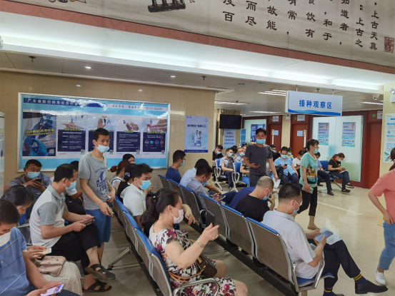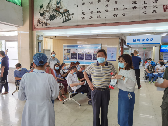 医院党委高度重视疫苗接种工作,前期工作部署周密,尽管本次接种群众多,接种当天现场秩序井然。候诊区,医院安保有序保障,江海街道领导干部有序发动群众、做好派号指引;登记区,医务人员严格按照新冠肺炎疫苗接种流程和技术规范,充分告知受种者注意事项,详细登记受众者信息,指导填写签订预防接种知情同意书,严格把握接种禁忌等;接种区,护士严格落实“三查七对一验证”制度,反复确定接种者信息,确保“一苗一码”;留观区,医生巡视做好医疗保障,留观区环境舒适,医疗设备齐全,播放新冠疫苗接种宣传视频等宣教。
