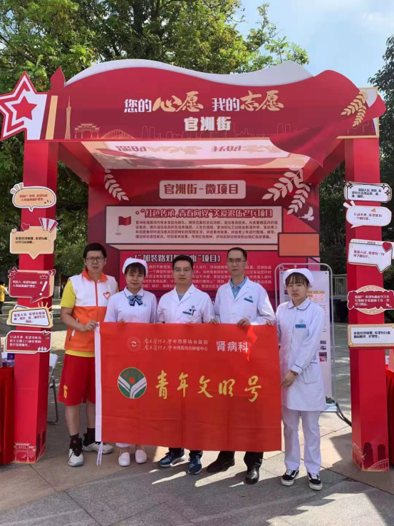 为将党史学习教育成果融入到日常工作,把学习成效转化为干实事的实际行动,切实守护群众健康。4月24日上午,“学史力行、为民办实事、义诊送健康”义诊活动在大石街社区卫生服务中心举行,我院内科党支部旗帜、肾病科青年文明号旗帜在活动现场迎风招展。