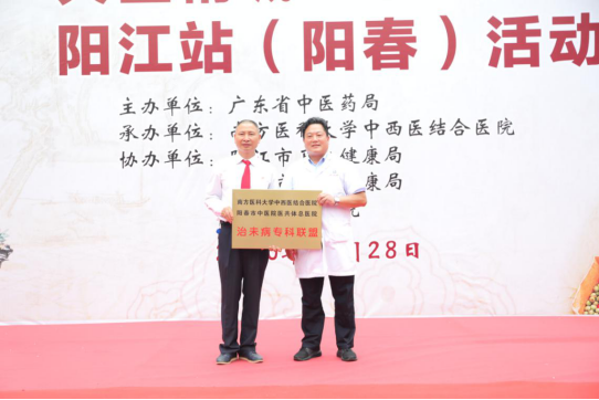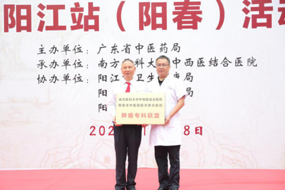 启动仪式上,我院李爱民院长、彭康副院长与阳春市中医院医共体总医院党委书记、院长陈永雄代表双方就成立肿瘤专科联盟和治未病专科联盟进行签约和授牌。