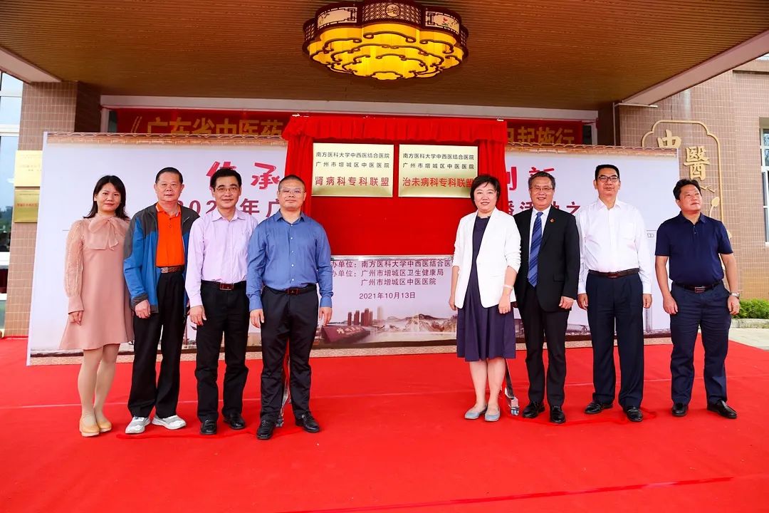 ▲省中医药局柯忠副局长、李文静主任科员,南方中西医李爱民院长、彭康副院长、罗仁教授、聂晓莉主任,增城区卫健局李志武副局长、医院杨武斌院长就治未病专科联盟和肾病专科联盟进行授牌。双方就探索跨区域专科合作共建的创新模式进行了深入交流,有效提升区域治未病专科、肾病医学医疗、教学、科研水平。