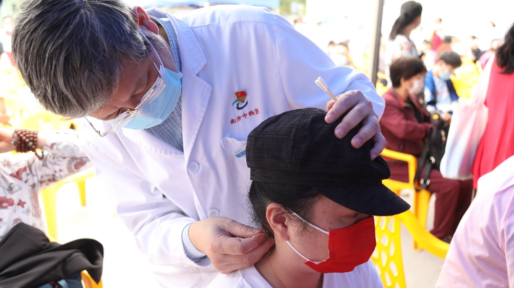 ▲为群众提供耳穴贴豆等中医特色护理服务